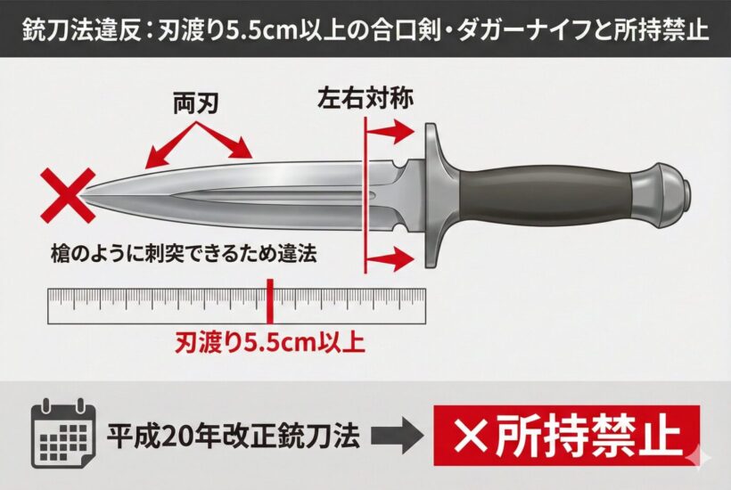 ダガーイコール左右対称。両刃であることが違法(槍のように刺突できるため)平成20年改正銃刀法により所持禁止になりました。