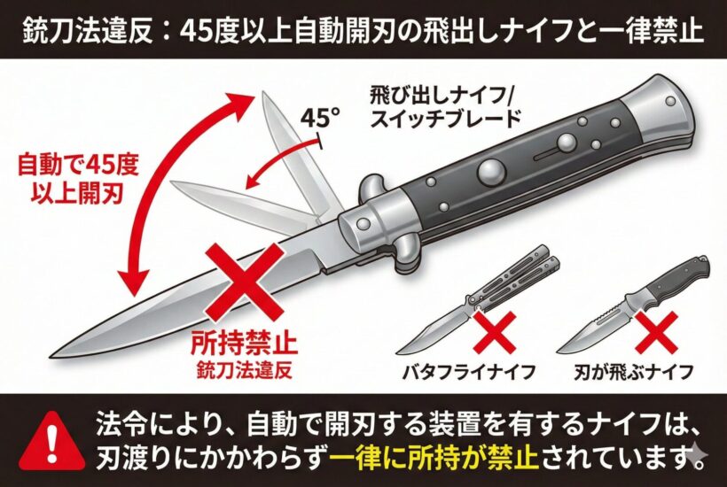 45度以上の自動開刃 飛び出しナイフ バタフライナイフは一律禁止!