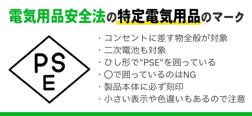 一部のカテゴリの製品について、日本の安全基準をクリアした証であるPSEマークまたはPSCマークが必要です。以下の製品について、マークがないものの販売は法律違反です。