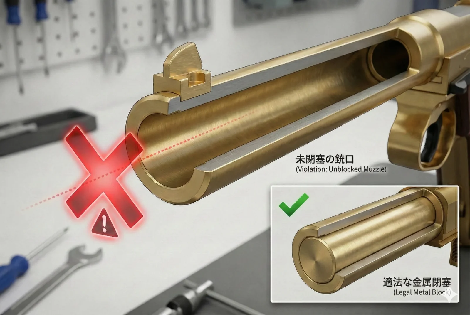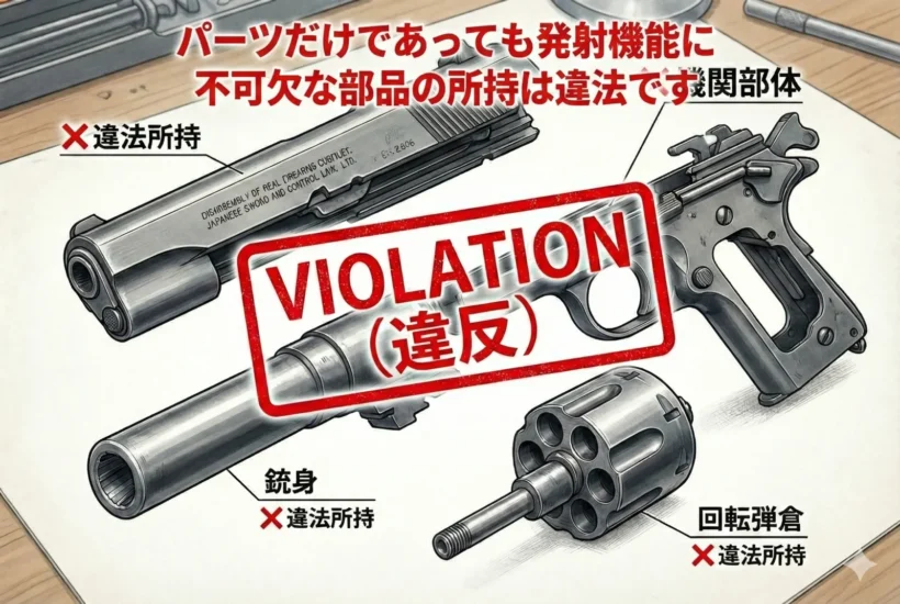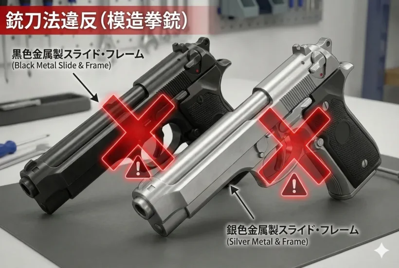 この状態は法令上の「模造拳銃」や「改造拳銃」に該当し、所持・譲渡・販売が一切禁止される重大な違法状態です。自身の所有品が法令に適合した構造であるか、必ず確認してください。