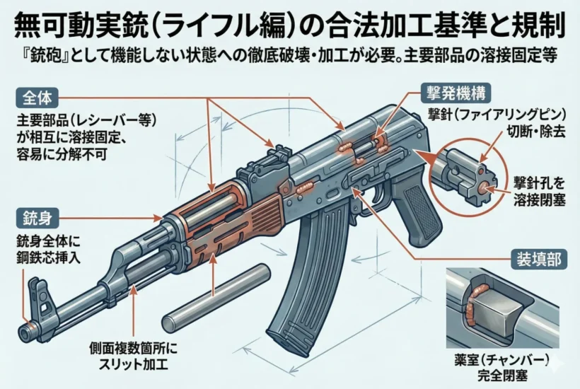 日本国内において、無可動実銃が「合法」とみなされるためには、単に弾が撃てないだけでなく、「銃砲」および「拳銃部品」のいずれにも該当しない状態まで徹底して破壊・加工されている必要があります。