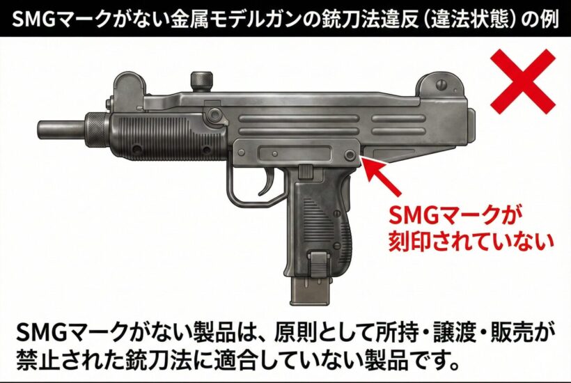 金属製モデルガンにおいて「SMGマーク」の刻印がない製品は、昭和52年の法改正により定められた安全基準を満たしていない「違法な模造拳銃」とみなされます。