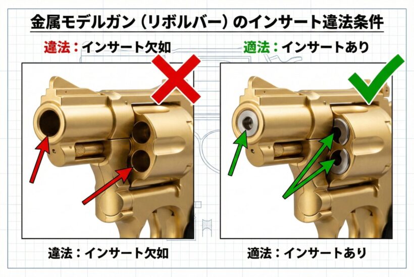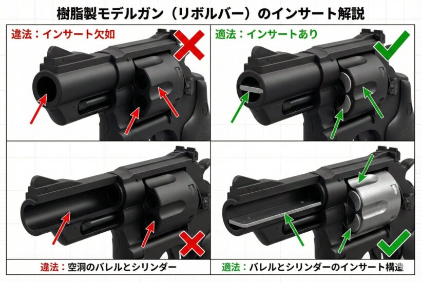 金属製モデルガンは、銃刀法により「銃腔(バレル)が硬質金属で完全に閉塞されていること」が厳格に定められています。シリンダーの隔壁にスリットがなく貫通している状態、かつ銃口が塞がれていないものは、銃腔が確保された「実銃に近い構造」とみなされます。